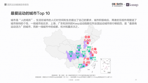 随着全民抗疫的持续,健康观念深入民众心。根据CBNData&Keep调研数据,近八成人表示疫情后自己更重视也更愿意运动了。其中一线城市的运动活力最高,北京、上海、广东和深圳的Keep运动指数位列全国运动城市排行榜前四。