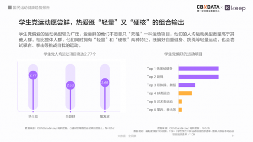 根据《报告》内容,学生党人均运动项目达2.77个,高于其他群体。他们既热爱“轻量”型的无器械健身、跳绳等运动,也对“硬核”类的攀岩、拳击等运动有所尝试。