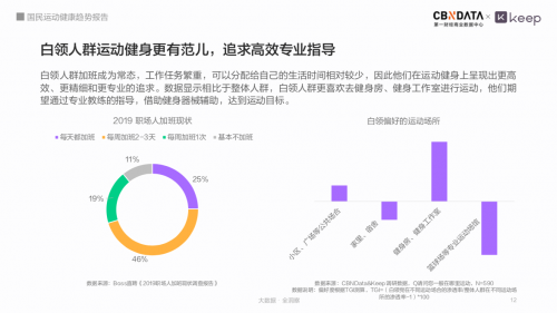 数据显示,近9成白领群每周会有加班情况,因此,他们在运动健身上呈现更高效、更精细、更专业的追求。《报告》发现,除了在公共场合和家中运动健身,白领群在选择健身房的比例高于整体人群,希望借助专业器材和教练,达到更高效的运动目的。