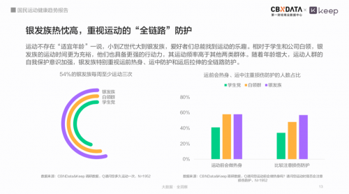 《报告》显示,54%的银发族每周至少运动三次。随着年龄增长,银发族更加注重身体的防护,从运动前的热身到运动中的防护以及运动后的拉伸,做到“全链路”防护,减少出现运动受伤的可能。