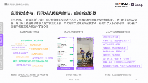 疫情防控期间,明星KOL、体育冠军等通过线上直播为宅家运动的人群提供专业指导和陪伴,增加了大众的参与感,也有助于促进运动人群坚持运动。