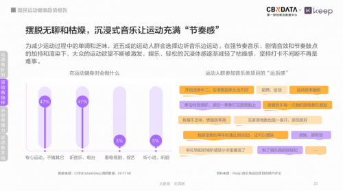 在日常的大众运动中,近五成的运动人群选择边听音乐边运动,音乐的节奏感能够激发坚持运动的欲望和乐趣,从Keep音乐类运动项目的用户评论可以看出,运动人群在参加完音乐类运动项目后表示“运动效率翻倍”。