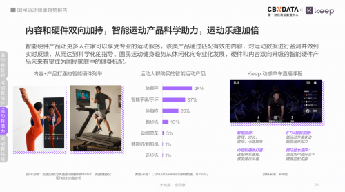 《报告》指出,体重称、智能手环、体脂称是最受运动人群欢迎的智能设备。智能装备通过数据监控来科学化指导运动,如Keep的动感单车能够监测路程、时长、卡路里等数据,并根据用户骑行水平来匹配课程内容,打通了运动的数字化升级。