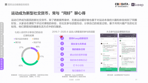 全民运动热潮下,运动逐渐成为一种新社交方式。《报告》发现,超过70%的运动人群会分享运动记录和成果,同时对运动相关话题的积极参与互动,有助于运动爱好者坚持运动,建立新的社交圈。