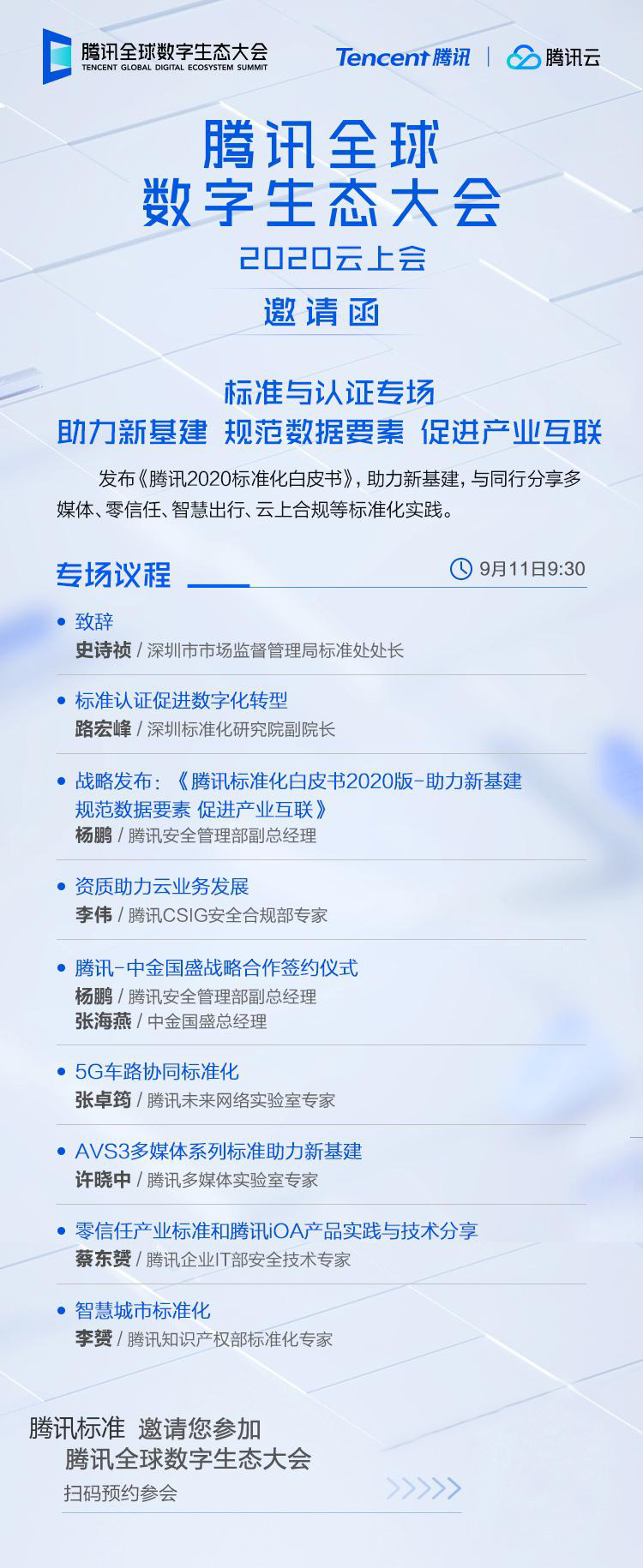 9月9-11日,2020腾讯全球数字生态大会在云端举办,其中在9月11日的9:30-11:00,2020腾讯全球数字生态大会“标准与认证专场”也将在线上召开,行业大咖云集,共同探讨当今世界数字生态领域的标准与认证问题,以及从多个维度展示在“后疫情时代”,为助力“新基建”,腾讯所作出的标准建设新成果。