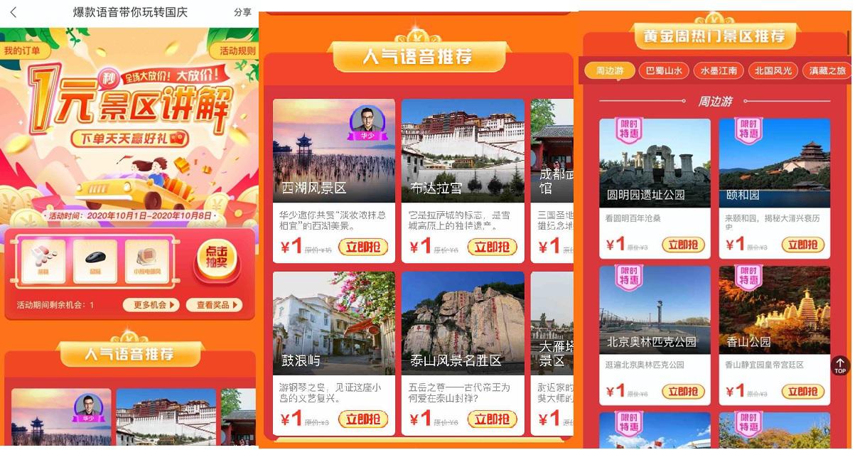 这个十一假期,百度地图特别联合北京尚智、广州三毛、杭州麦扑、美景听听、上海畅听、上海麦克风六家公司推出“有声城市地图”付费语音讲解优惠活动,活动覆盖国内4A、5A级景区。价值12、18元的明星学者语音讲解包,活动期间只需1元即可体验,下单还有机会参与抽奖,赢得周边玩偶、打车券等好礼。