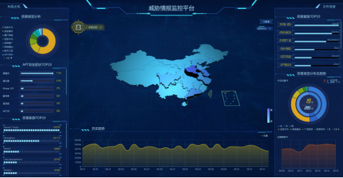威胁情报收集能力对应着奇安信威胁情报监控平台,该平台是基于奇安信的大数据能力以及APT攻击威胁情报,对APT团伙攻击活动的可视化监测系统。