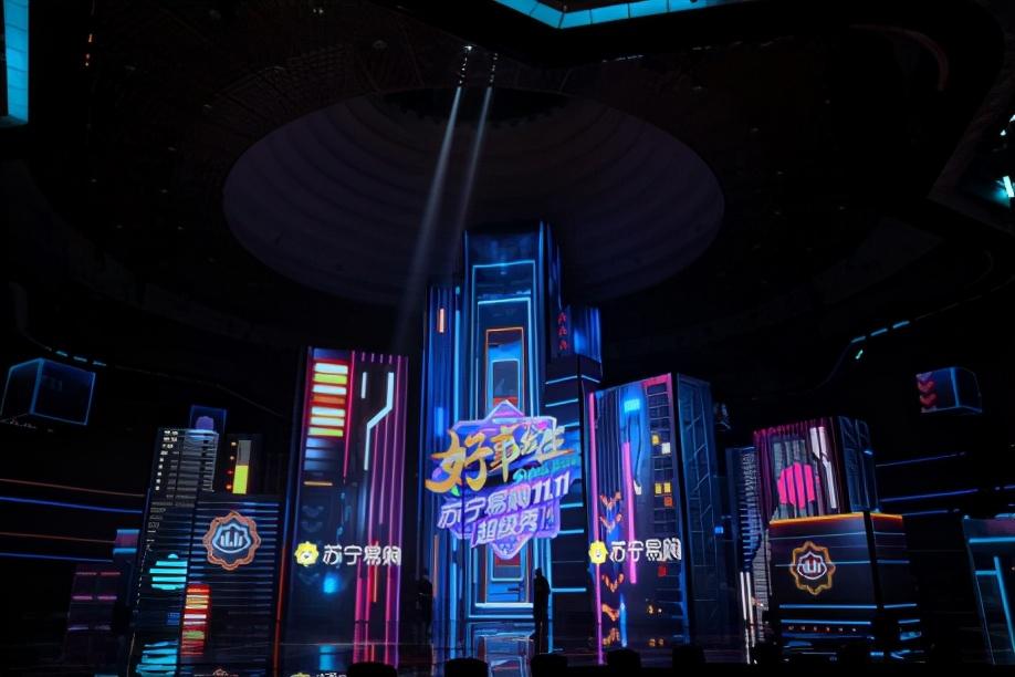 主舞台顶部设计像极了苏宁易购吉祥物的头部,舞台中央坐落着一个个大小不一的视频盒子,搭配如同天空下的一座城市。舞台负责人介绍,此次超级秀舞美结合了苏宁全场景的独特优势,舞台以“天地”为主题,突出此次双十一是属于线上+线下的全场景、合家欢。