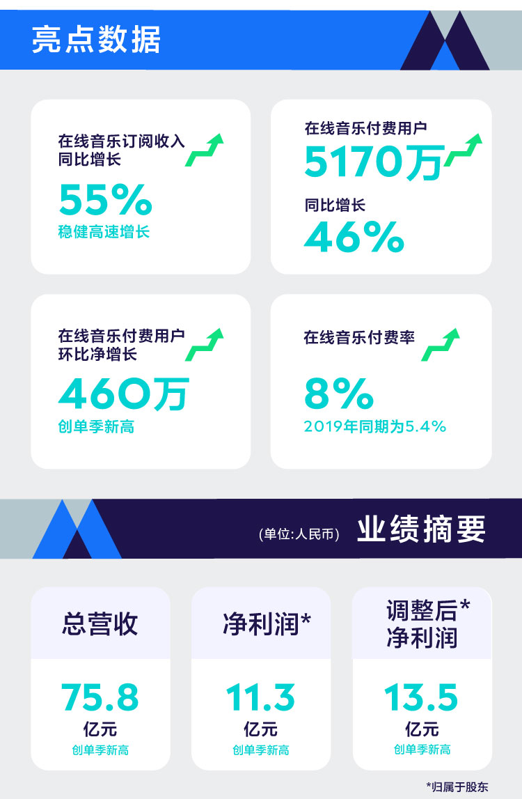 11月11日,腾讯音乐娱乐集团(NYSE:TME)发布截至2020年9月30日的第三季度未经审计的财务报告。财报显示,2020年第三季度,腾讯音乐总营收同比增长16.4%至人民币75.8亿元,归属于公司股东净利润为人民币11.3亿元,非国际财务报告准则下(Non-IFRS)归属于公司股东净利润为人民币13.5亿元。