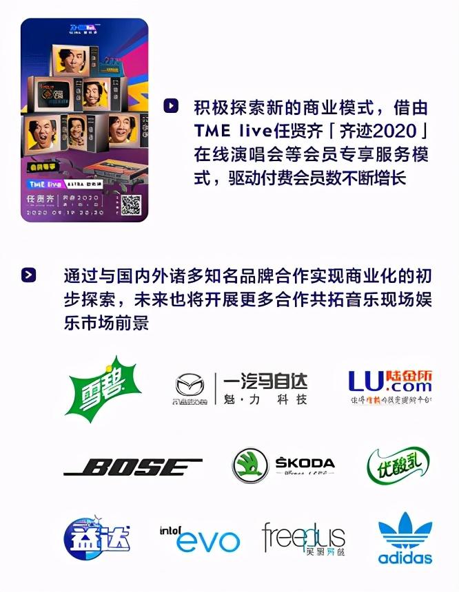 借由TME live任贤齐「齐迹2020」在线演唱会等会员专享服务模式,驱动付费会员数不断增长,这也进一步说明了TME live规模化发展的延展性和巨大的商业化潜力。TME live的持续成功,验证了其在商业层面的逻辑,也更深入地激发了用户付费潜力,持续挖掘未来音乐产业新的价值增长点。
