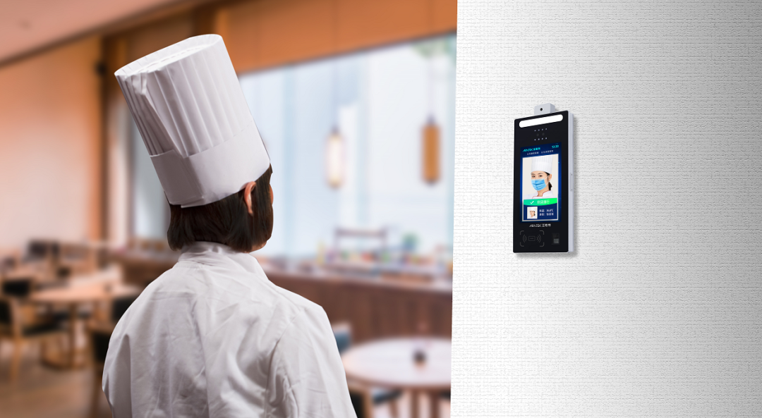 亚略特人脸识别测温晨检机可智能识别厨师资格身份、健康证监测,完善厨师考勤管理和陌生人闯入预警管理;红外测温功能可测量厨师体温,助力疫情防控;