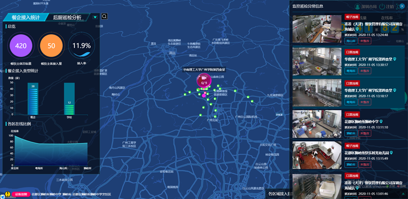 智慧监管大数据可视化平台可接入校园、供餐单位食堂和后厨视频监控数据、AI报警数据,实现3D地图可视化监管指挥、疫情防控地理空间可视化、AI报警地理空间可视化、视频监控可视化,推进各地学校和供餐单位对食堂和后厨智能、规范、精准、联合监管。