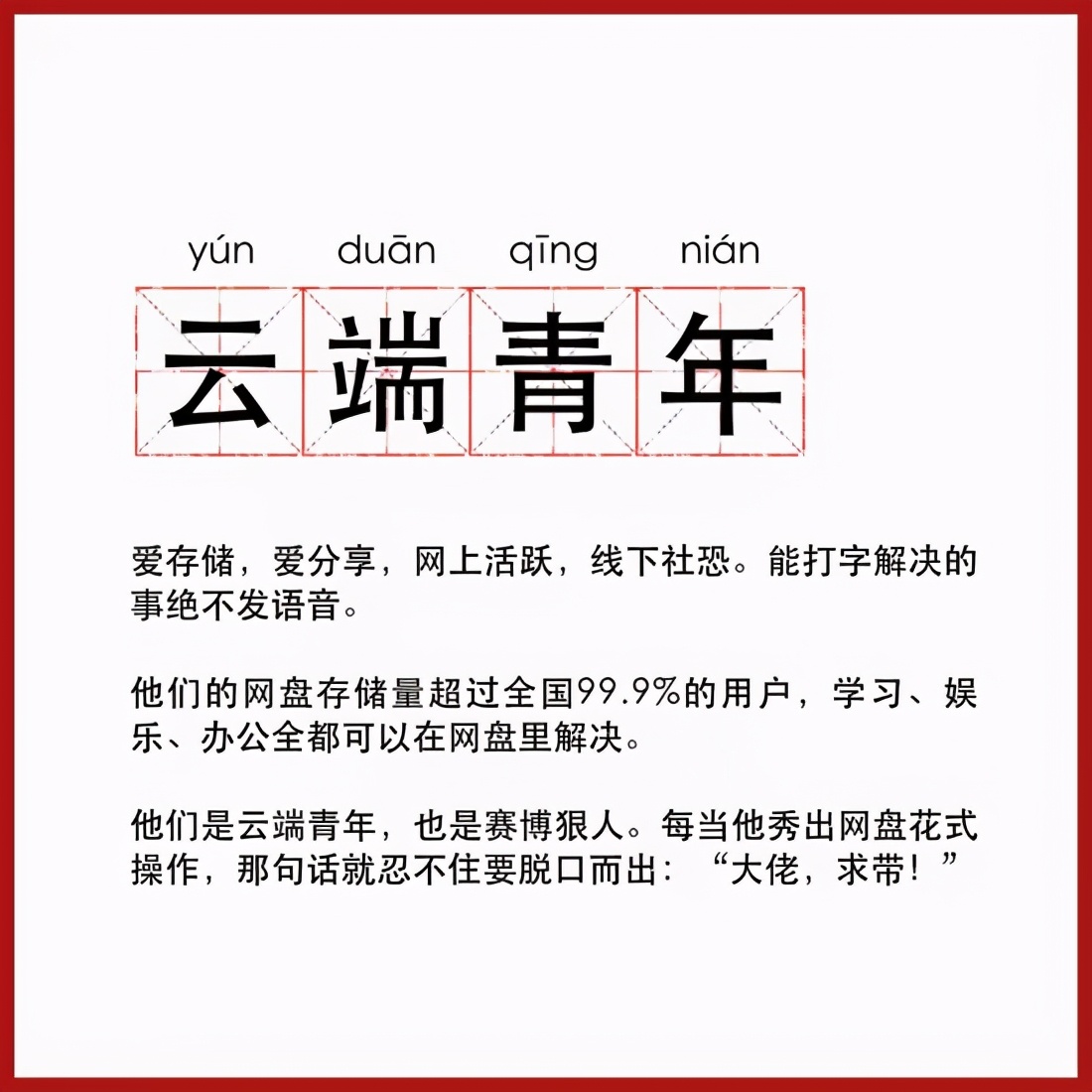 他们爱存储、爱分享,网上动若脱兔,线下习惯性社恐,是不折不扣的“赛 博人”。他们身上有着明显的特质——网盘资源丰富,数据存储量足以击败全国99.9%的网盘用户。