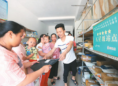 安徽省淮北市濉溪县四铺镇张圩村电商便民服务站的负责人辛清建(右一)将快递发放给村民。