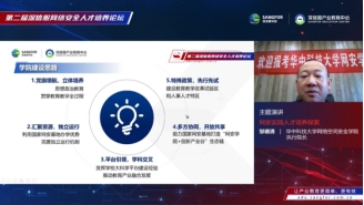 华中科技大学网络空间安全学院执行院长邹德清做《网安实践人才培养探索》主题演讲,介绍学院在人才培养方面实施“分级通关”综合实践能力培养方案,该方案是目前国内唯一在本科教学中系统性推行综合实践能力培养的学校;同时,学院努力建设教学与科研紧密结合、学校与社会密切合作的实践教学基地,作为国家网安基地的智库和产业创新源头,华中科技大学与国家网安基地共同打造极具特色的“网络安全学院+网络安全产业谷”模式,是目前国内唯一的国家网络安全人才与创新基地建设的核心单位之一。