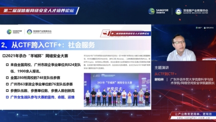 广东外语外贸大学信息科学与技术学院/网络空间安全学院副院长谢柏林做《从CTF到CTF+》主题演讲,介绍CTF竞赛正在改变我国网络安全生态,从人才培养和输送,到承担社会服务、科研、项目合作的重任。尤其是广外网络安全实验室2016年组建由本科生组成的 “广外女生”战队,积极参加国内的网络安全竞赛,成绩斐然。学院致力于培养富有社会责任感和创新意识,专业基础扎实、实践能力突出、跨文化交际能力强的高素质信息科学技术人才。