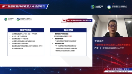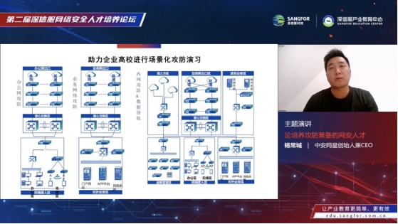 深信服教学教研中心主任严波做《开辟网络安全实战型人才培养新路径》主题演讲,深信服教学教研中心是深信服产业教育资源的核心组成部分,是深信服产业人才培养体系的智库;面对网络安全产业的快速发展和企业对专业技术人才需求量的持续激增,深信服开辟网络安全实战型人才培养新路径,融合岗课赛证,尤其在以赛育人上,以多样化赛制、多元化赛道帮助人才画像,让人才成长的路径更清晰。