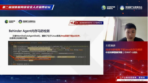 中国刑事警察学院“ISWAT-U”战队队长黄昊天,在线分享参赛心得,表示与大多数传统的线上CTF比赛不同,这次比赛把赛题融入真实靶场环境,让竞赛更加需要团队凝聚力,更加考验团队的合作能力。“深育杯”这场赛事能与前辈、杰出“CTFer”们一起同台竞技,明白自身的不足,欣赏到高手们的极客能力。之后,黄昊天针对当前Java安全研究的重点领域,从主流内存马的技术实现到RASP检测与反检测来讨论攻防视角下的内存马博弈。