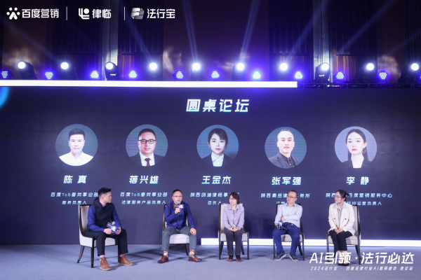 在圆桌对话环节,百度ToB垂类事业部商务负责人陈真、百度ToB垂类事业部法律服务产品负责人蒋兴雄、陕西创迪律师事务所合伙人王金杰、陕西秦岳律师事务所运营总监张军强、陕西博德百度营销服务中心法律行业运营负责人李静就大模型时代下,法律行业线上营销获客的挑战与机遇进行了深入讨论。嘉宾们一致认为,随着人工智能技术的不断发展,法律行业正迎来前所未有的变革。百度法律智能体提供的行业解决方案不仅能更好地满足用户对于法律服务的需求,也为律师律所提供了强大的营销支持和技术支撑,助力律师律所数字化高效获客。