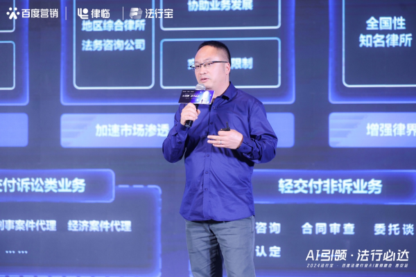 百度ToB垂类事业部总经理谢天为大会开场致辞。他提到,随着生成式AI的发展进步,科技成果不断深入司法场景,也为法律行业带来了全新的商业模式与发展机会。百度作为法律行业需求与服务双端的“桥梁”,在过去三年里解决了大量用户在不同领域的海量法律问题和需求。大模型时代,百度不断推动AI与法律行业的深度融合,持续探索和打磨大模型在法律领域的专业应用,打造出了百度法律智能体,也为行业提供了更有针对性和突破性的解决方案。