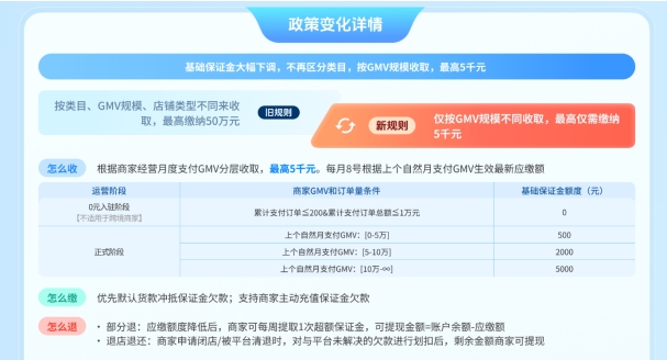 基础保证金即平台向商家收取的开店押金。新版保证金除了简化规则之外,还大大降低了商家的保证金标准:以商家上个月支付GMV5万元、10万元为分界线,基础保证金降为500元、2000元、5000元三档。相较于调整前大部分类目最高保证金为2万元的这一标准,降幅高达75%。