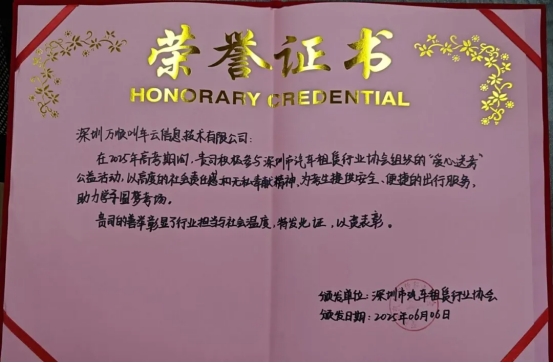 万顺叫车广东公司在今年高考期间组织上百辆爱心送考车,其中深圳分公司凭借专业细致的服务赢得了考生及行业组织的高度认可,活动结束后获颁行业协会表彰奖励。
