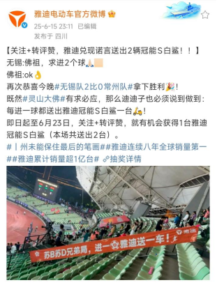 全民追更的“苏超”赛场激战正酣!在无锡队以2:0战胜常州队的精彩对决后,雅迪兑现承诺:每进一球,即送出一台雅迪冠能S白鲨!即日起至6月23日,只需关注雅迪电动车官方微博并完成转评赞,即有机会赢取这款市场上广受欢迎的雅迪冠能S白鲨。
