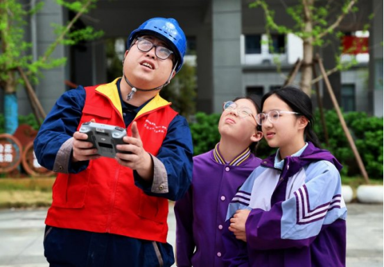 操控无人机的,是国网磐安县供电公司的青年志愿者施康祺。他平时的工作就是带着这架“小飞机”,翻山越岭去巡检配网线路。今天,他和同事们走进六年级二班,想把日常工作中的故事讲给孩子们听。