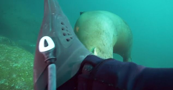 这位来自瑞士的谷歌员工只能看着这只海狮继续啃他的脚蹼