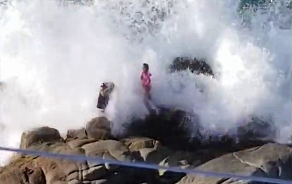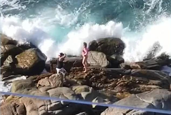 视频显示,一位“敬业”的男友正拿着相机,站在高低不平的岩石上,为面前的女友拍照。该女子身穿粉红色的比基尼,将手放在臀部摆弄姿势,梦幻般地看着远方。 然而,突然一个巨浪袭来,拍打着这对情侣。女子伸开双臂,设法保持身体的平衡,没有被冲倒。男子则被冲倒在后面的岩石上,同时他举起自己的相机,以免碰坏或被海水淋湿。巨浪将男子头上的棒球帽冲掉了,女子赶忙走过去查看男友情况。
