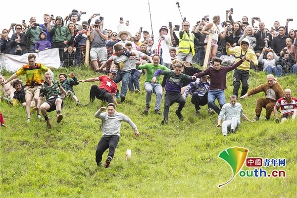 英国举办年度“滚奶酪”大赛 参赛者滚山坡“人仰马翻”