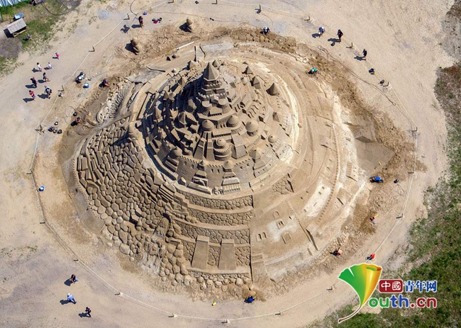 当地时间2019年6月5日,德国梅克伦堡-前波莫瑞州,当地举办沙雕节。沙雕艺术家们试图让这座高17.5米的沙雕建筑挑战吉尼斯世界纪录。