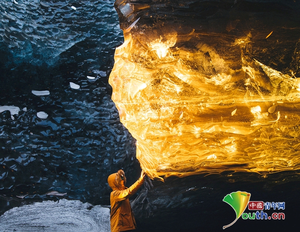 摄影师在冰岛冰洞拍摄到罕见一幕 冰块发出金光如琥珀
