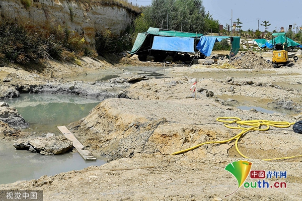 当地时间2019年7月24日,法国西南部查伦特,志愿者在一个古生物学遗址中挖掘出一只距今1.4亿年、长2米、重约500公斤的侏罗纪时期蜥脚类恐龙股骨化石。
