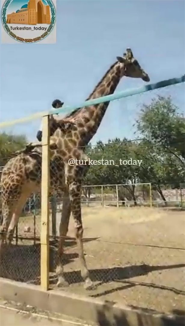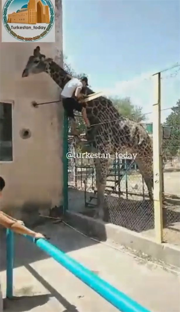 据英国《镜报》7月31日报道,达萨克斯坦一名男子在醉酒后爬上了希姆肯特动物园巨大的围栏,跳上了长颈鹿的后背。