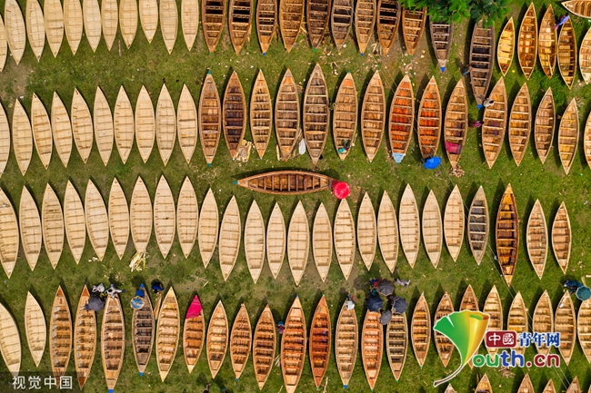 在孟加拉国最大的船舶市场,数百艘木船被排列整齐等待出售。买家从各地涌来,赶在雨季到来前购买船只。雨季期间,孟加拉国很容易因暴雨导致河岸决堤,使洪水淹没城镇和村庄,这意味着人们必须乘船出行。这些木船和桨都是当地工匠手工制作的,仅售17英镑(约合145.7元人民币)。