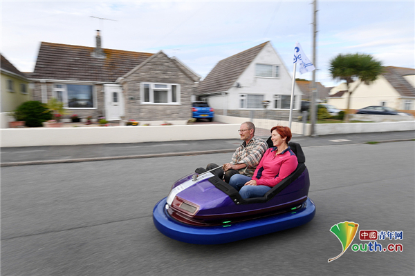 2020年8月25日讯,英国多塞特郡波特兰,Chris Acock和Zarra Lea驾驶着碰碰车改造的车出门兜风,路上的机动车或许希望避免撞上这辆古怪的车。工程师Chris Acock在eBay上花30英镑(约合272元)买了一辆旧的碰碰车,将其与一辆机动代步车结合,改装出这款新车。当两夫妻开着这辆时速8英里(约合13公里)的车出行时,都会给当地居民带来欢乐。
