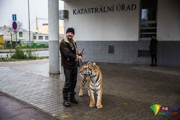 2020年10月14日报道(具体拍摄时间不详),David Tesinsky是一名捷克摄影师,他在捷克奥洛穆茨拍摄到“宠物主人”Jaromir Joo带着重约600磅的老虎在公共场所散步令人震惊的画面。其中一张照片,Jaromir Joo牵着老虎过马路。另外一张照片,老虎依偎着主人自拍展现出独特的关系。据悉,Jaromir Joo经营着引起争议的马戏团,有大约80只动物。