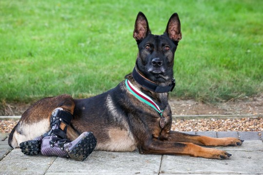 不幸的是,Kuno的两条后腿都中弹了,它不得不切除一只爪子,并安装上定制的假肢。现已退休的它被授予PDSA迪金奖章,以表彰它对职责的奉献。