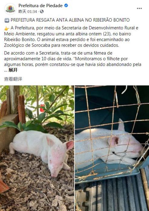被救的小白化貘。图片来源:彼达迪市政厅社交媒体账号截图。