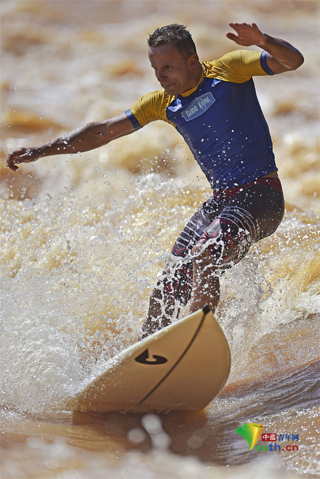 当地时间2021年1月9日,巴西瓦拉达里斯州长市,冲浪者保罗·圭多在多塞河上冲浪。随着米纳斯吉拉斯雨季的到来,多塞河的水位上升,吸引了苦于没有海滩一展身手的冲浪者。