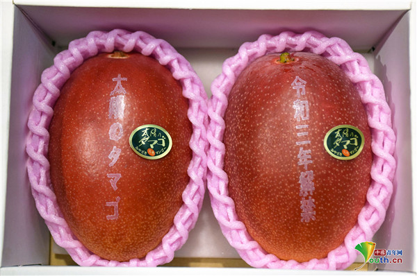 当地时间2021年4月15日,日本宫崎县,顶级芒果“太阳蛋”举行了2021年度的首次拍卖。其中,有两颗芒果以20万日元(约合人民币12000元)的价格卖出。