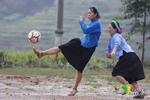 当地时间2021年4月25日,越南广宁省,身穿传统服装的San Chi族女子在足球比赛中玩耍,这是越南节日Soong Co节的一部分。这场比赛吸引了数百名观众。所有14名球员都身着传统服装,身穿蓝色长袖衬衫、黑色短裙,头戴发带。
