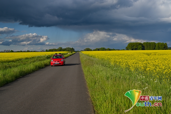 当地时间2021年5月24日,德国勃兰登堡州,阳光下的油菜花田金灿灿美如画卷。