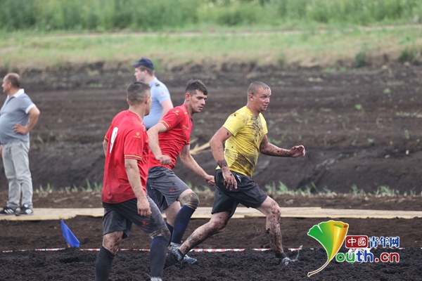 当地时间2021年6月26日,白俄罗斯明斯克,民众参加沼泽足球赛。据悉,参赛者用胶布包裹鞋子可以避免陷入沼泽泥地中。