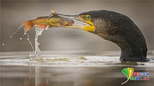 匈牙利国家公园内,一只饥饿的大鸬鹚在湖上捕猎,用嘴叼住了一条超出它咀嚼能力的棕色大头鲶鱼,这条滑溜溜的鱼不停地扭动着身子,饥饿的鸬鹚不得不与之搏斗以获取食物。