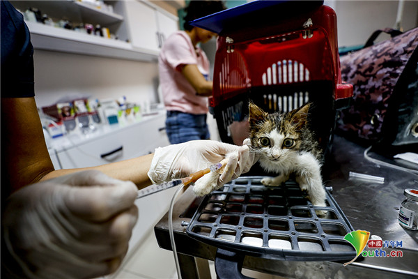 当地时间2021年7月31日,土耳其安塔利亚,土耳其兽医正在为在南部山火中受伤的一只小猫进行治疗。