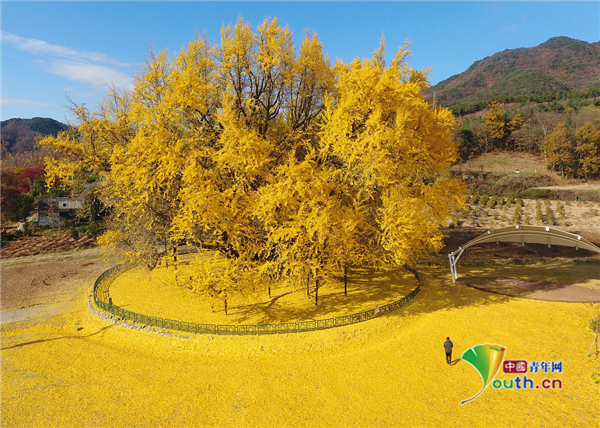 当地时间2021年11月11日,韩国江原道原州市,当地的一颗古银杏树仿佛落了一地叶子,满地金黄。据推测,该银杏树树龄达800年,高34.5米,最大周长14.5米,东西方向37.5米,南北方向31米左右。