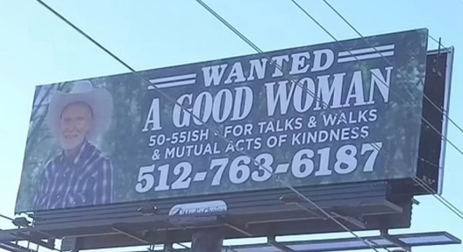 据悉,来自美国的Jim Bays为了寻找一个新的开始,他把家从华盛顿搬到了德克萨斯州,而且他花钱在德克萨斯州的高速公路旁一个巨大的广告牌上刊登了征婚启事,希望可以通过这种方式找到陪自己度过余生的真爱。
