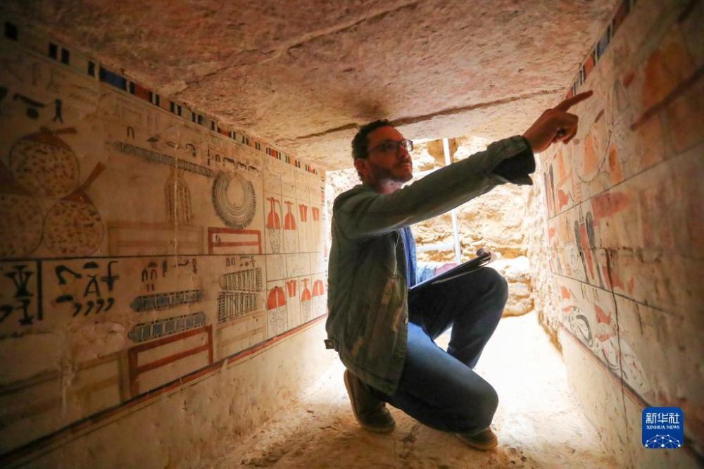 3月19日,在埃及首都开罗以南的塞加拉地区,考古工作者在一处古墓内介绍壁画。